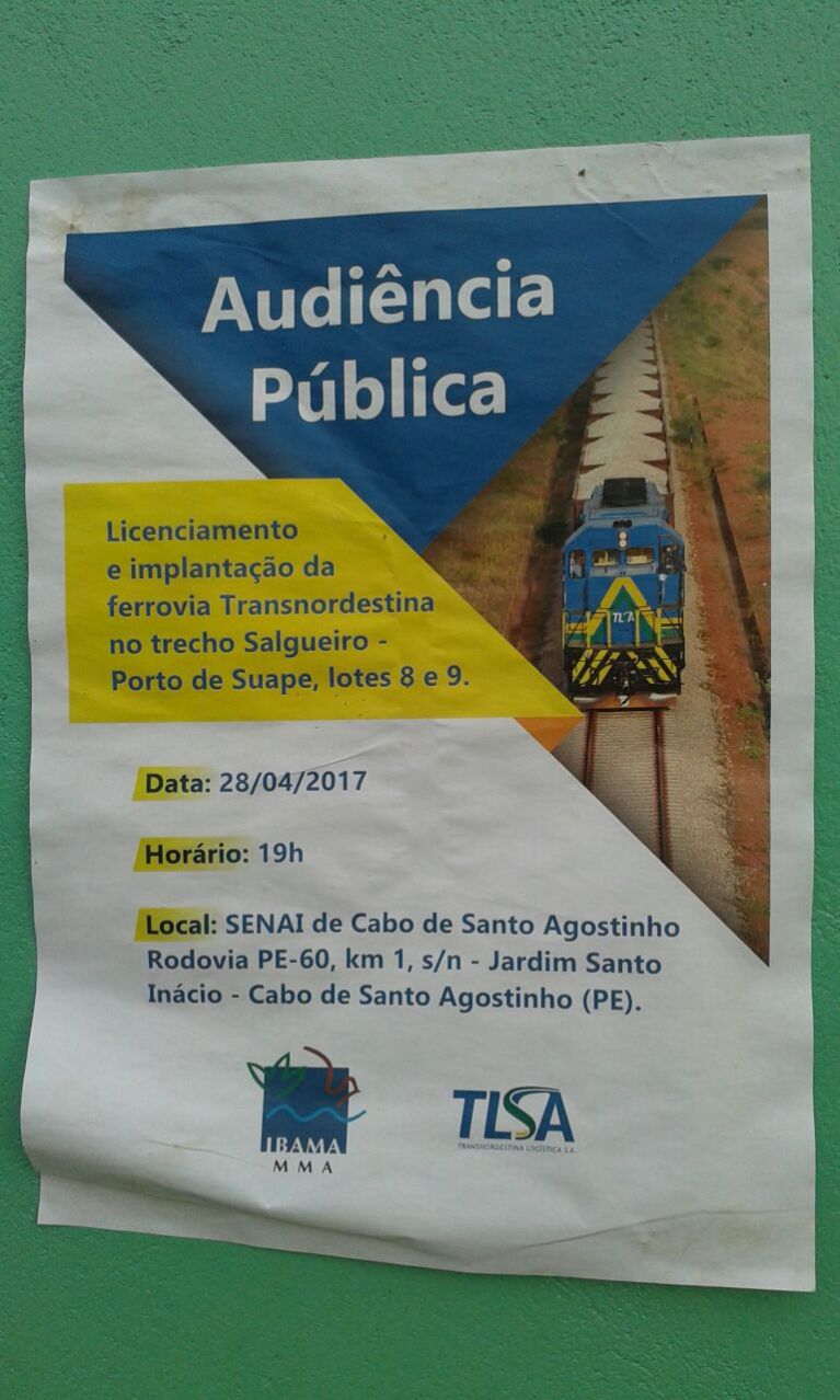 A preparação e mobilização da população para participar da audiência Pública para licenciamento e implantação da ferrovia Transnordestina no trecho Salgueiro – Porto de Suape, lotes 8 e 9, se fez representar pela formação da Mesa, onde sentaram representantes da Transnordestina e da Superintendência Regional do IBAMA de Pernambuco. Ausentes estavam as autoridades municipais, estaduais e a sociedade civil. Este importante evento para o Estado de Pernambuco e o Nordeste do Brasil não teve por parte do Estado Brasileiro o valor para vida econômica da região, há décadas apregoado como “projeto estruturante”, “modernização das relações econômicas” e outros adjetivos valorativos dados pelas autoridades estatais em implantar um projeto que está orçado, após muitos aditivos contratuais, em mais de onze bilhões de reais.